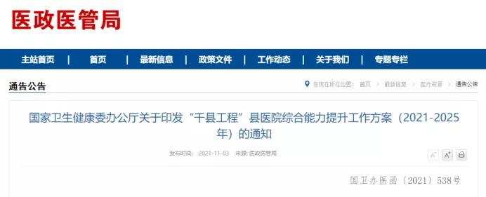 11月3日,国家卫生康健委印发《“千县工程”县医院综合能力提升事情计划(2021-2025年)(以下简称《事情计划》)。