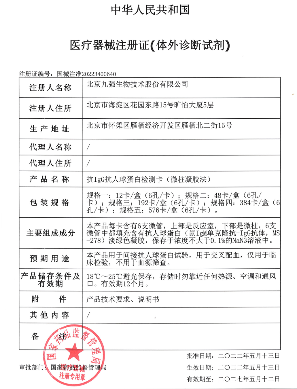 尊龙官方平台生物顺遂取得国家药品监视管理局揭晓的抗人球卵白(抗IgG+C3d)检测卡(微柱凝胶法)和抗IgG抗人球卵白检测卡(微柱凝胶法)的《医疗器械注册证》。