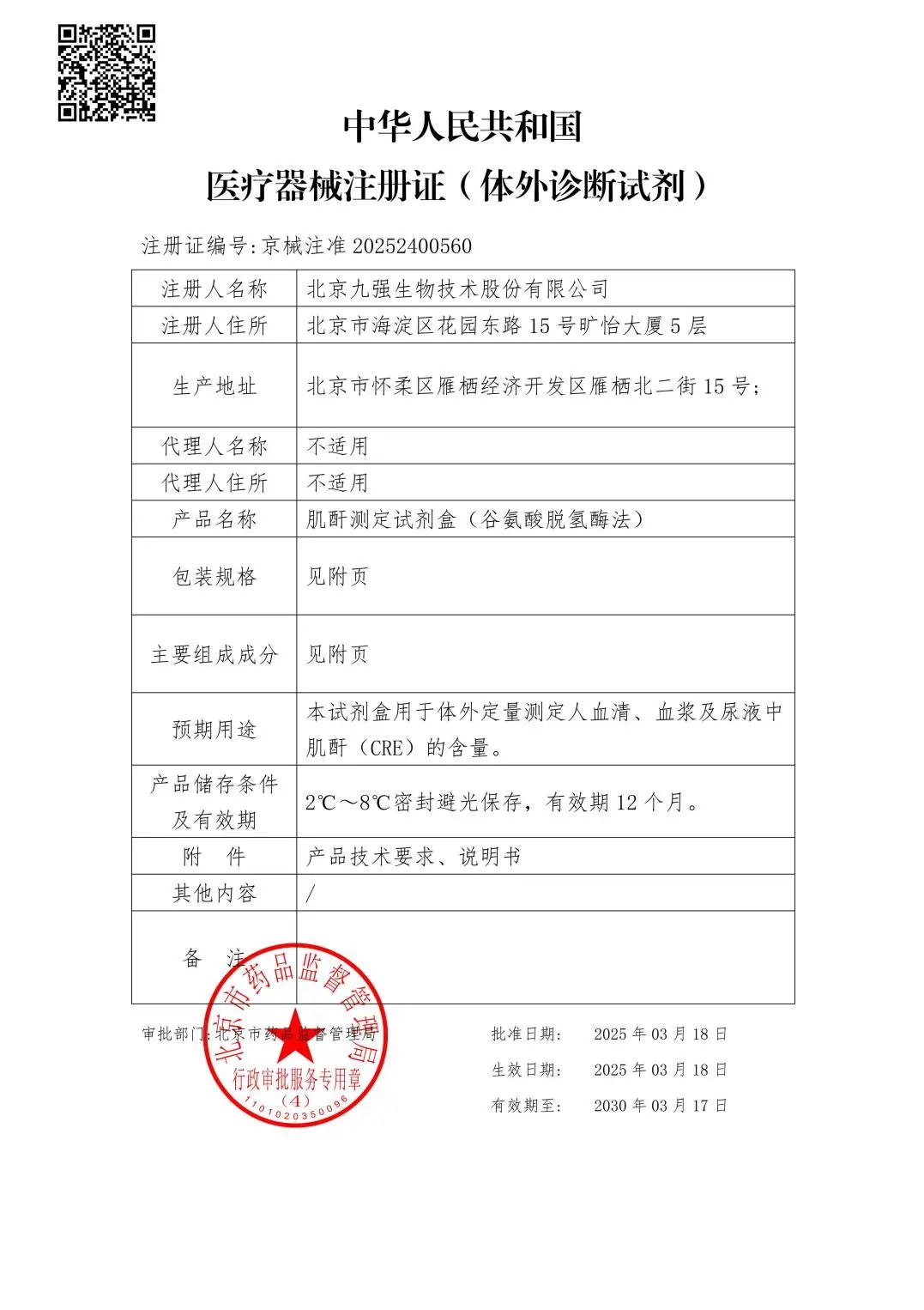 再添利器!尊龙官方平台生物肌酐测定试剂盒获证!
